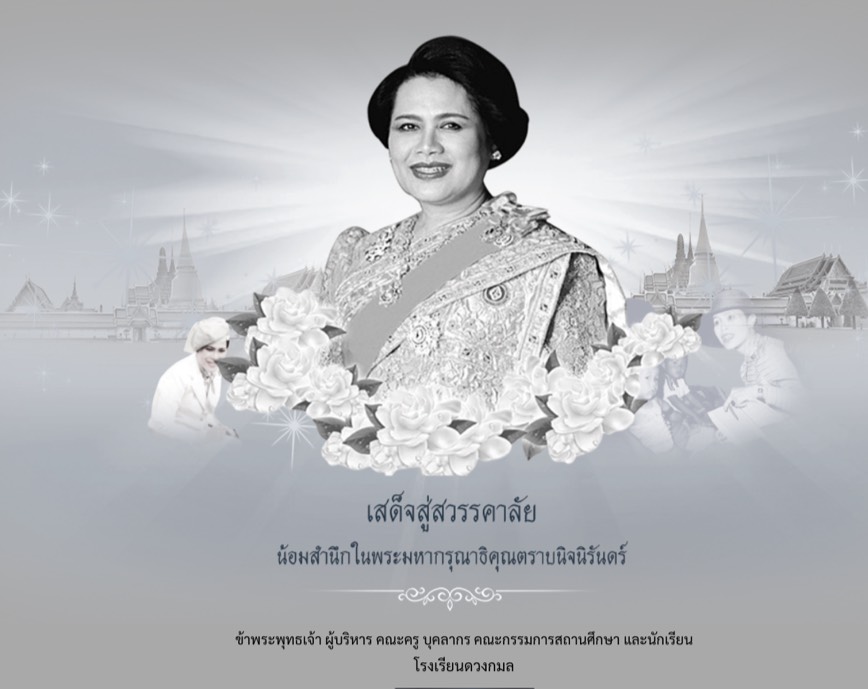 น้อมส่งเสด็จสู่สวรรคาลัย สมเด็จพระนางเจ้าสิริกิติ์ พระบรมราชินีนาถ พระบรมราชชนนีพันปีหลวง ธ สถิตในดวงใจไทยนิรันดร์ ๒๔ ตุลาคม ๒๕๖๘ ด้วยเกล้าด้วยกระหม่อม ขอเดชะ ข้าพระพุทธเจ้า ผู้บริหาร คณะครู บุคลากรทางการศึกษา นักเรียน โรงเรียนดวงกมล เทศบาลนครรังสิต