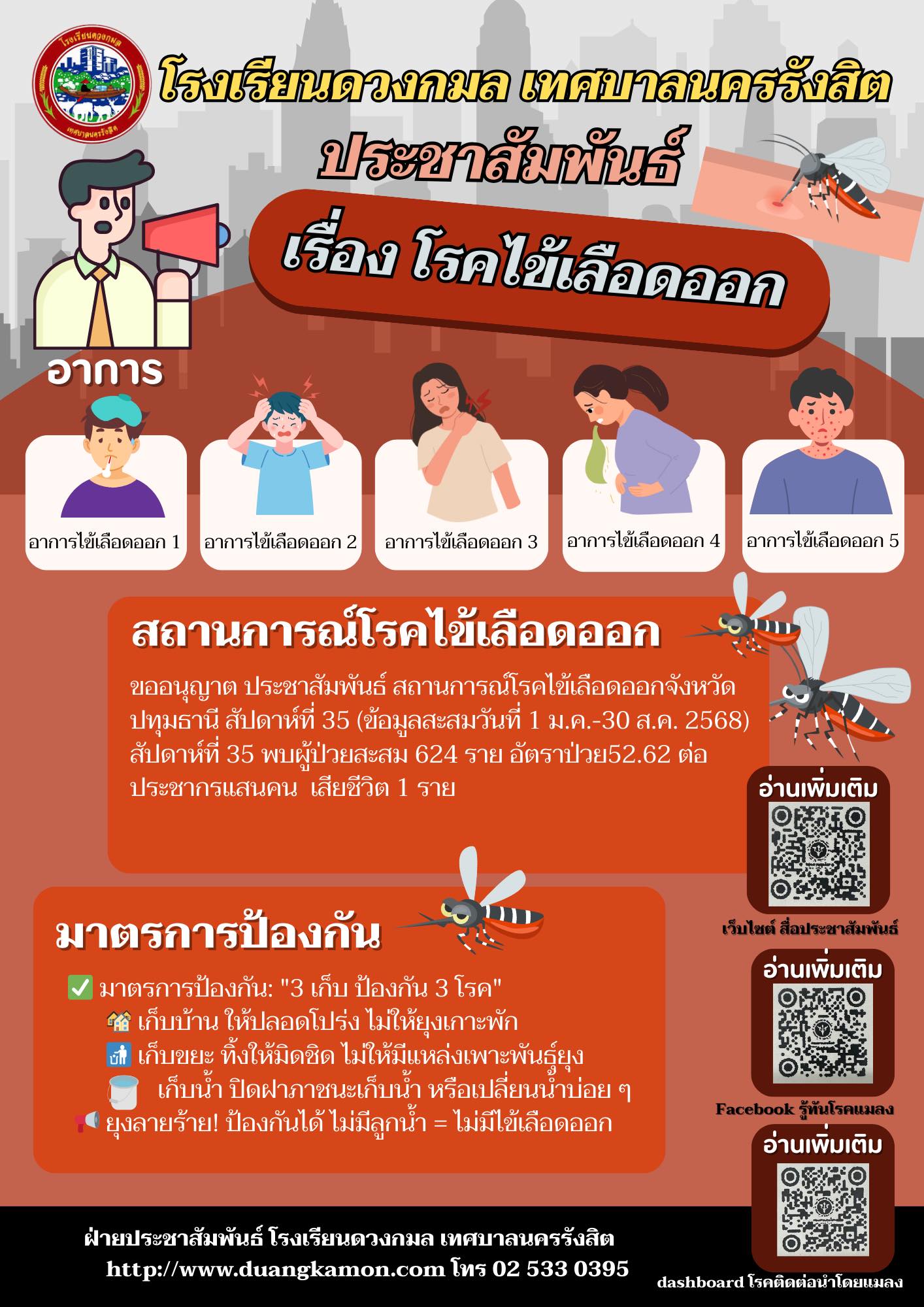 โรงเรียนดวงกมล เทศบาลนครรังสิต ประชาสัมพันธ์ เรื่องโรคไข้เลือดออก (ยุงลาย...ภัยร้ายของไข้เลือดออก อันตรายถึงชีวิต) อาการ ไข้สูงลอยเกิน 2 วัน มีผื่น จุดแดงขึ้นตามลำตัว ปวดศีรษะ อ่อนเพลีย ปวดเมื่อยตามตัว คลื่นไส้อาเจัยน เบื่ออาหาร การป้องกัน